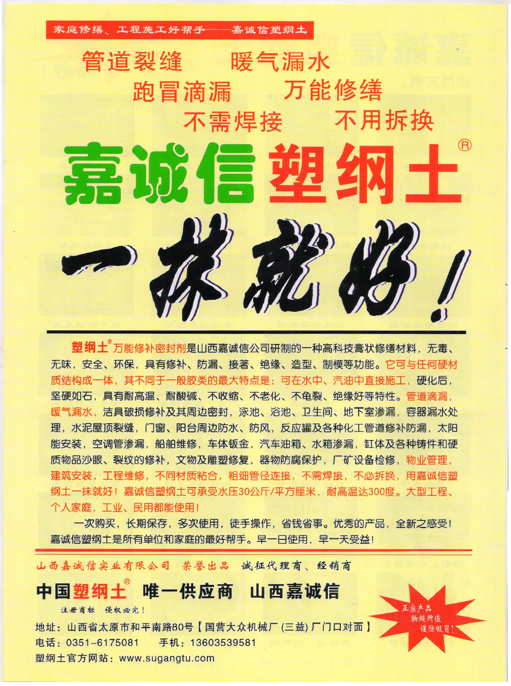 山西嘉誠信實業(yè)有限公司多年來,一直致力于“塑綱土”(國家注冊商標)修補密封劑在我國的推廣、應(yīng)用和研究,用戶遍布各地。長期以來,山西嘉誠信實業(yè)有限公司投入大量人力、物力和財力,通過各種媒體及其它方式對”塑綱土”品牌進行市場推廣和大力宣傳,使“塑綱土”品牌在業(yè)內(nèi)享有相當知名度和影響力,深受廣大用戶的青睞和厚愛。