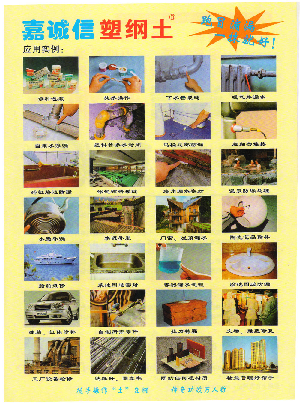 山西嘉誠信實業(yè)有限公司多年來一直致力于塑鋼土的研究、開發(fā),為塑鋼土在我國的推廣、應(yīng)用與普及立下了汗馬功勞!嘉誠信早已成了塑鋼土的代名詞,嘉誠信就是塑鋼土,塑鋼土就是嘉誠信。跑冒滴漏滲就找嘉誠信,要買塑鋼土還找嘉誠信,已成為廣大用戶的共識!
